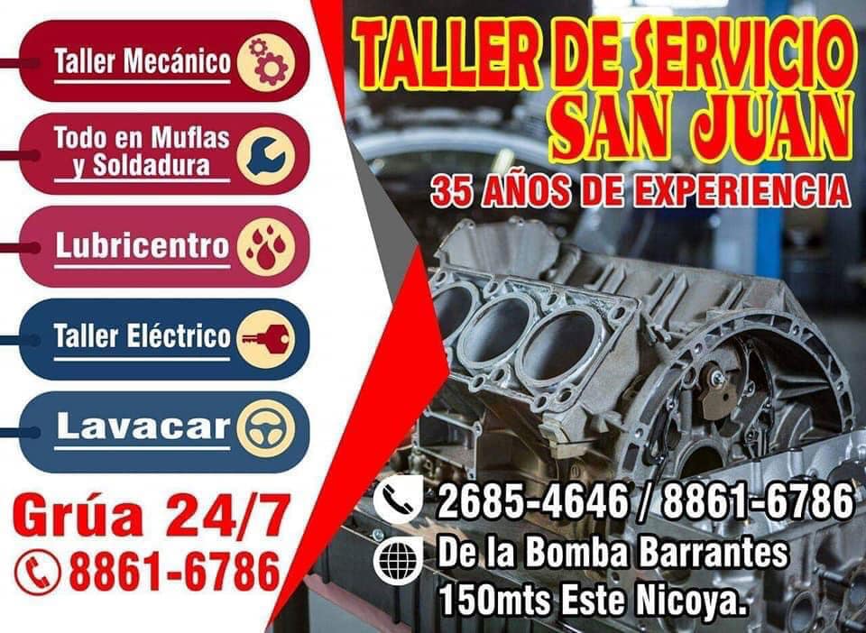 TALLER DE SERVICIOS, MECÁNICA GENERAL. ESPECIALISTAS EN MUFLAS, SOLDADURAS, ALINEAMIENTO, ESCANER, GASOLINA Y DIESEL, LIMPIEZA DE INYECTORES, AUTO LAVADO, CATALIZADORES, EMISIÓN DE GASES, TALLER ELÉCTRICO, VENTA DE REPUESTOS, FRENOS, CLUTH Y MUCHO MAS,SERVICIO DE GRÚA ATENCIÓN A TODA GUANACASTE. EN GRÚAS DE PLATAFORMA 24 HORAS, RESCATE EN CARRETERA.